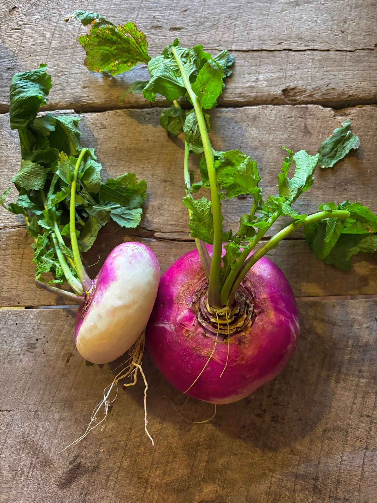 Small, round roots with smooth purple and white skin and a delicate, slightly peppery flavour. Grown by Wild Farm, they're delicious roasted, mashed with butter, or sliced thin for salads and slaws. Their tender texture and subtle sweetness make them a beautiful addition to any winter dish.